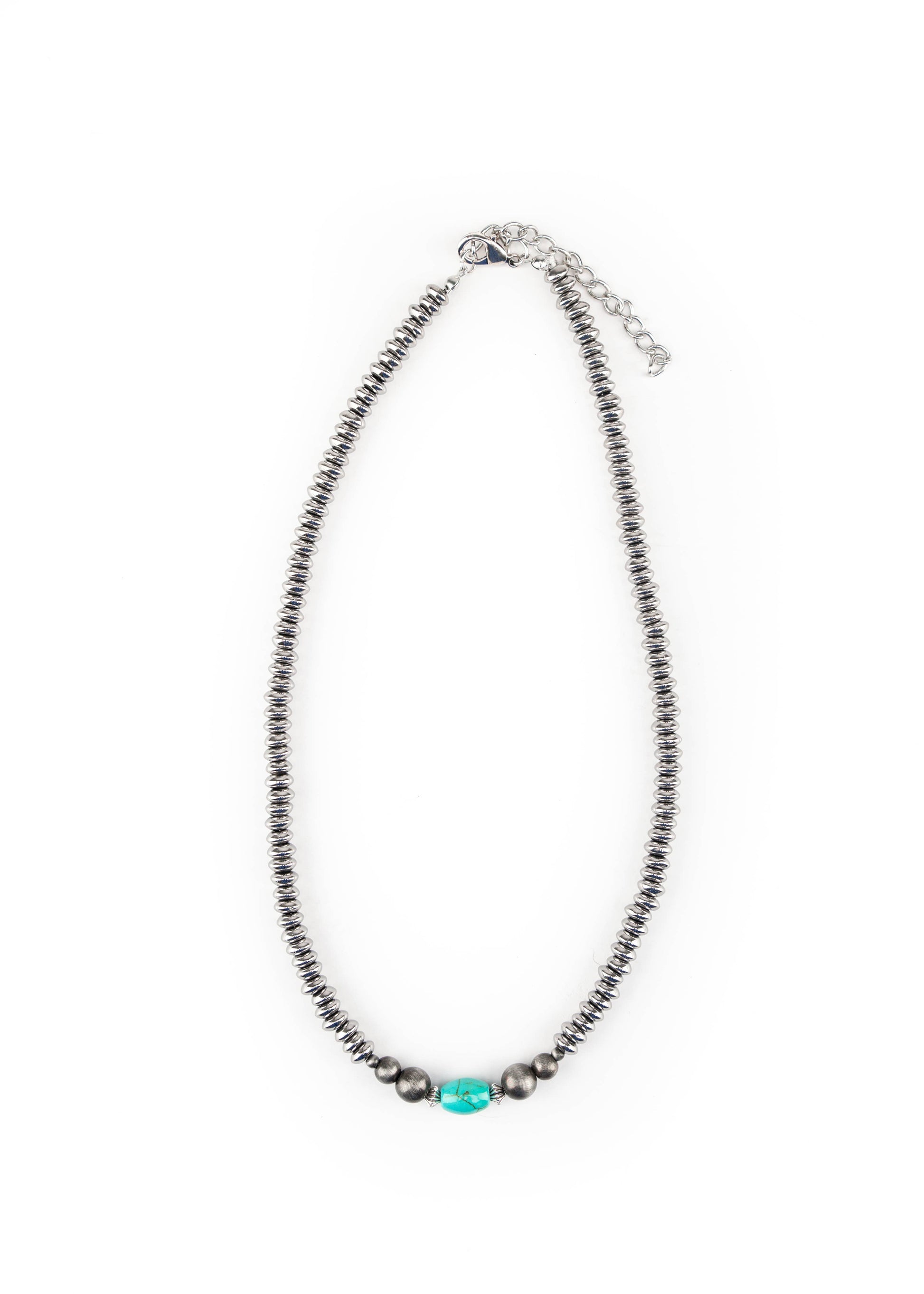 16" Silver Disc Beaded Necklace with Green Turquoise and Faux Navajo Pearl Accent