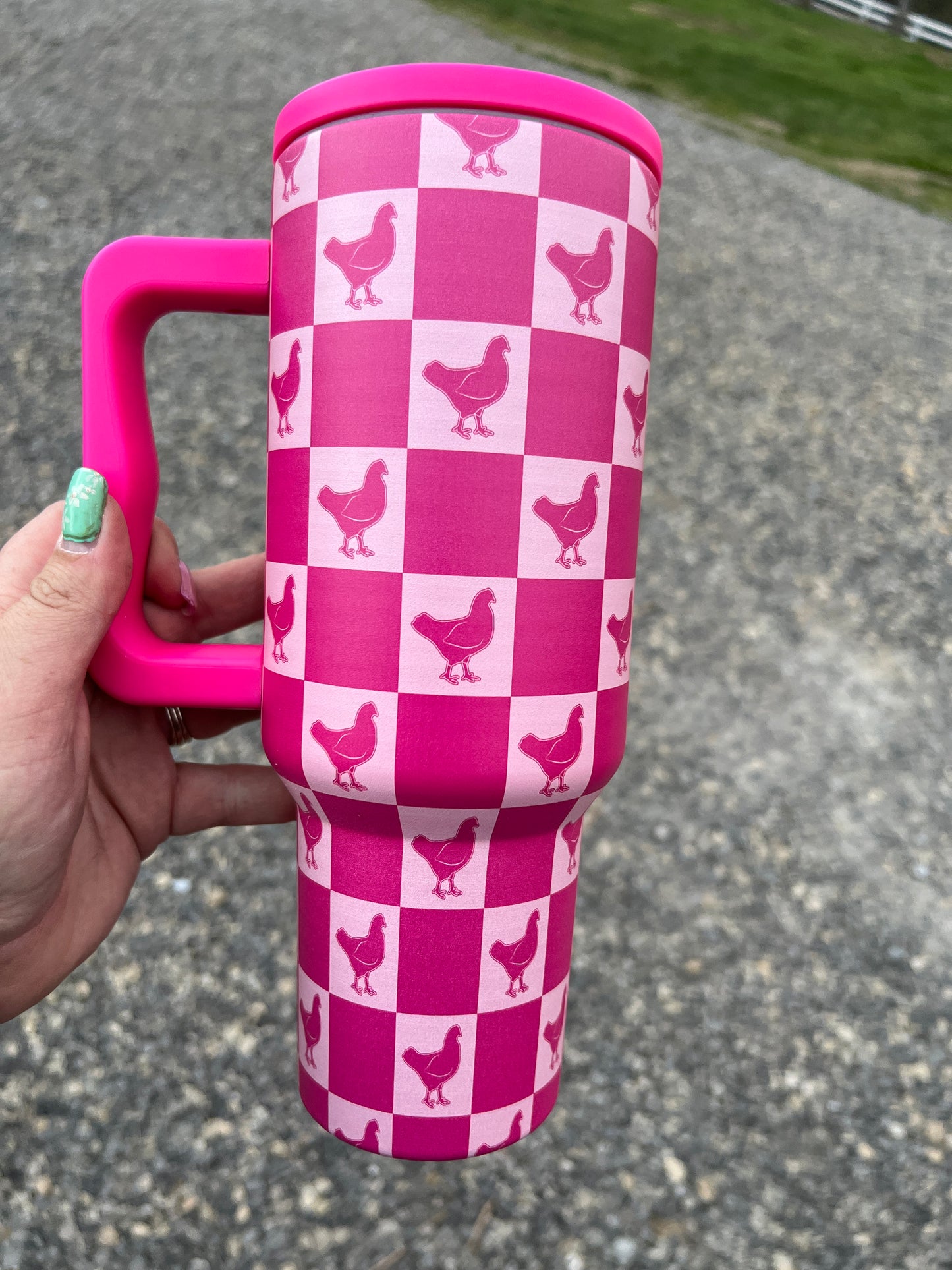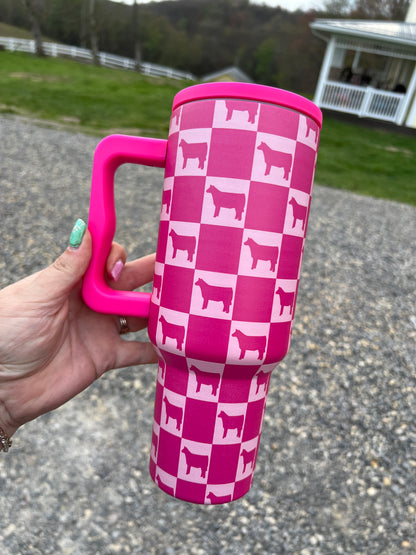 Were obsessed with checks and throwing show animals on there has really made us head over heels for this new design. Available in 4 livestock species! This design is super sleek on these 40z insulated cups! You won't see these cups leaking, these are fully sealed and perfect for those on the go! Swap the lid direction for a left or right handed cup! Stainless steel Hard Plastic Straw Rated 6hrs warm and 12hrs cold Sleek design allows for easy cupholder fit **Do not wash in dishwasher. Pigs, cows, chickens and rabbits will be coming soon! These are hard to get!