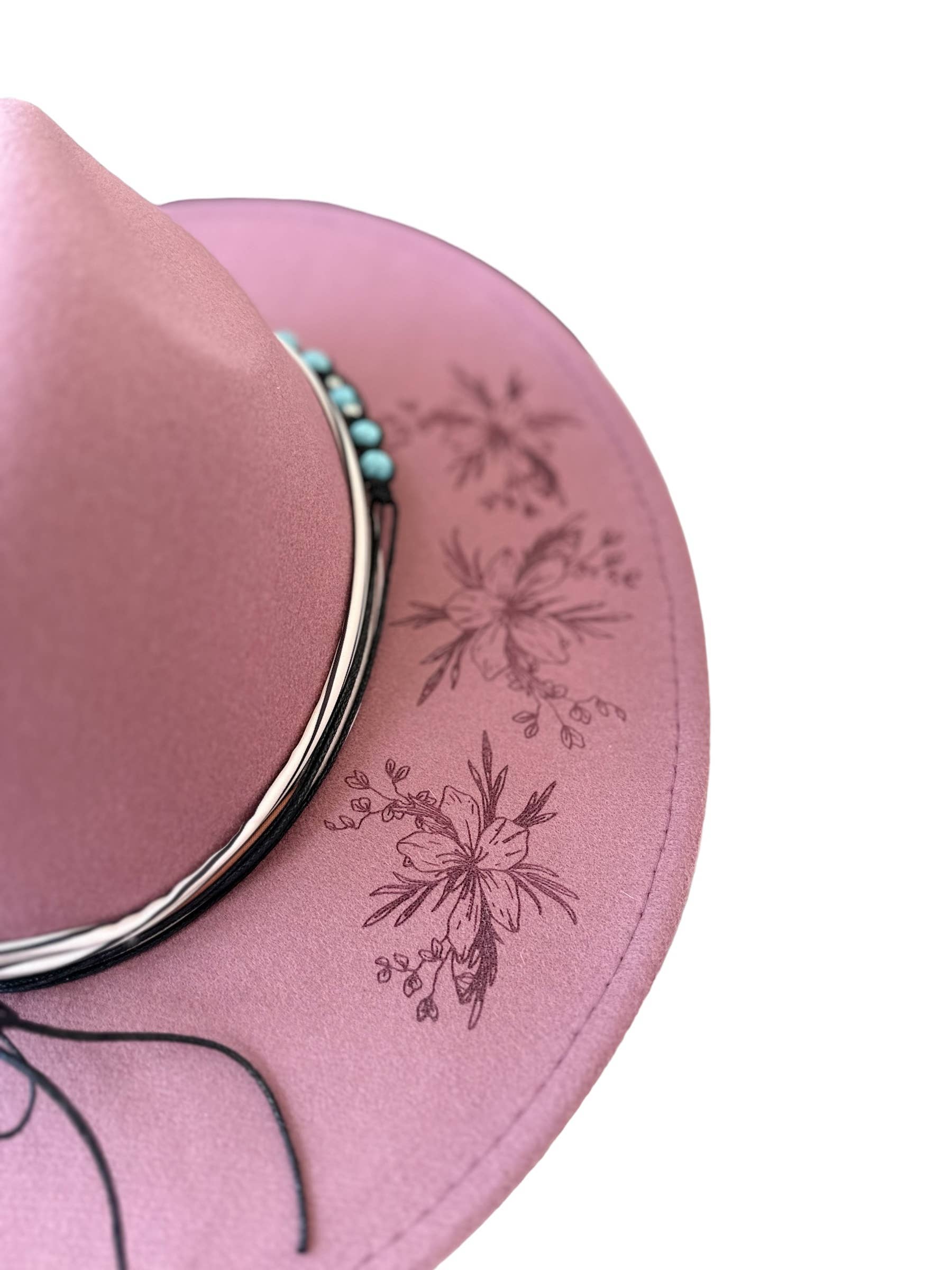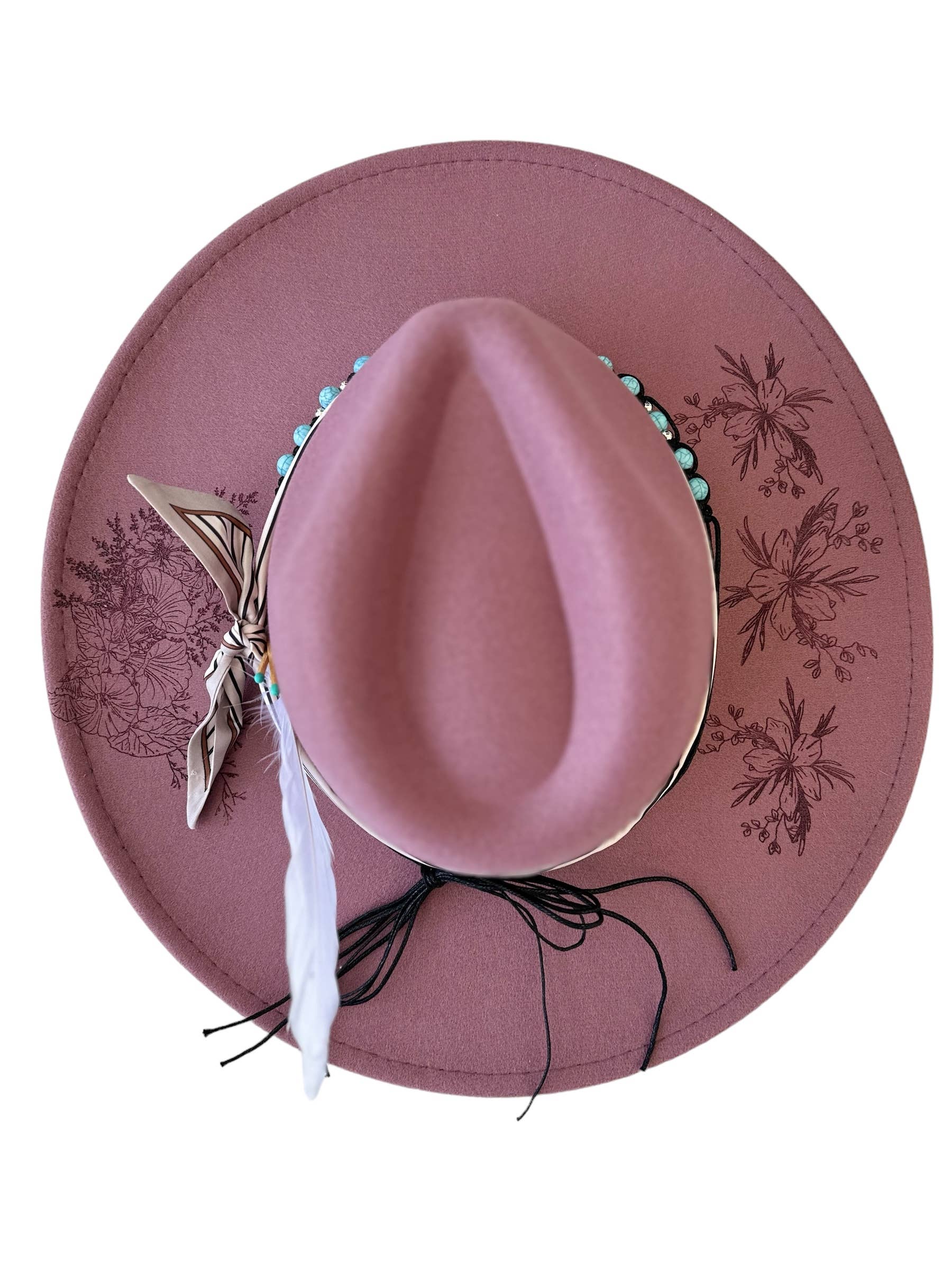 Beautiful floral designs on the most gorgeous, mauve colored rancher hat! Delicate florals on either side of the brim. Shown on Mauve rancher.