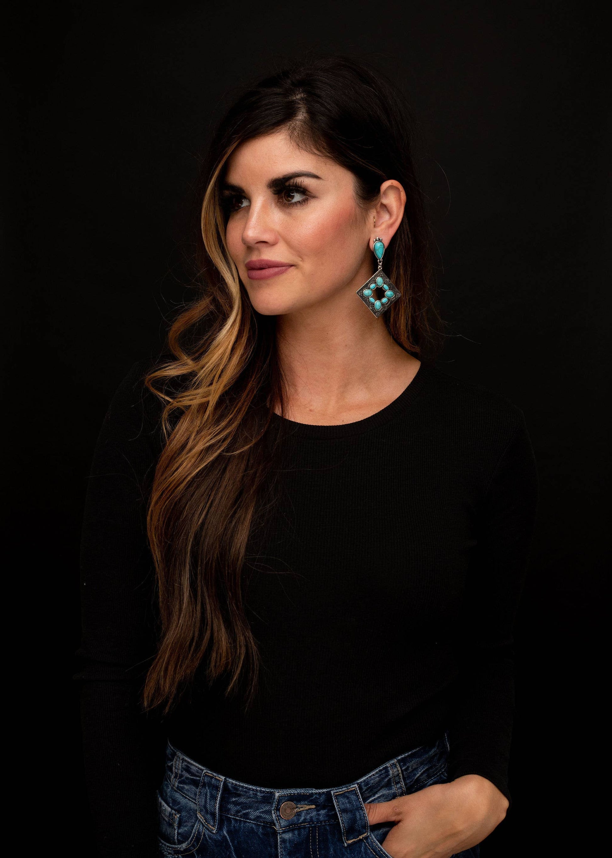 Make a bold Southwestern statement with our 3" Burnished Silver Stamped Diamond-Shaped Post Earrings with Turquoise Accents Around the Center. These eye-catching earrings feature intricate stamped detailing in a burnished silver finish that gives them a vintage, handcrafted feel. The diamond-shaped design is enhanced with turquoise stones surrounding the center, adding a vibrant pop of color and classic Western charm. At a dramatic 3" length, these post earrings are perfect for making a statement—whether at a rodeo, concert, night out, or simply elevating everyday outfits. Lightweight enough for comfortable wear yet striking in design, they’re a versatile piece every cowgirl needs in her jewelry collection. Now available at a special sale price, making this the perfect time to snag them before they’re gone!
